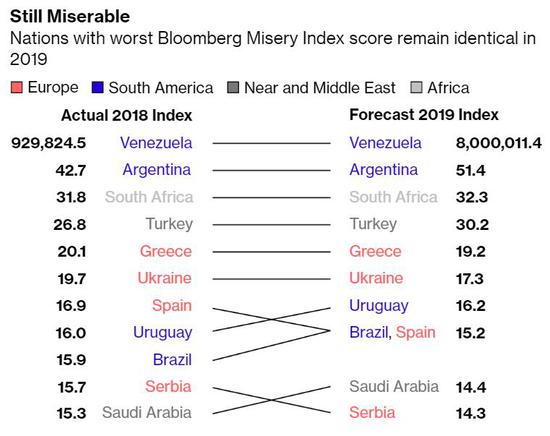 彭博本月公布的2019年悲惨指数报告对全球62个经济体进行了排名,委内瑞拉连续第5年被评为全球最悲惨经济体,彭博调查的经济学家预计该国今年通胀率预计将达到令人瞠目的8000000%。