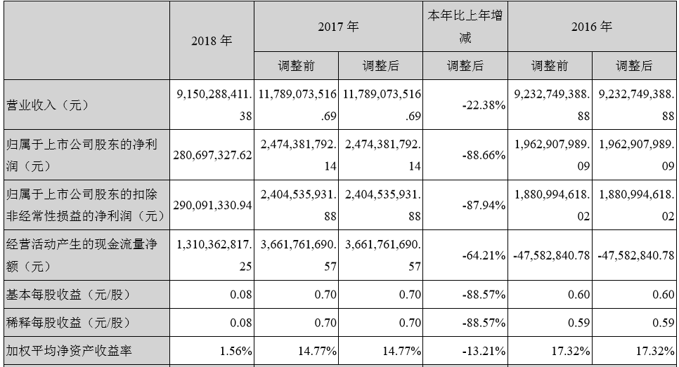 年报显示,2016年-2018年,ST康得新营业收入分别为92.33亿元、117.89亿元和91.50亿元;归属于上市公司股东的净利润分别为19.63亿元、24.74亿元和2.81亿元。上述两项指标分别同比下降22.38%和88.66%。在2018年前三季度,ST康得新分别盈利7.15亿元、7.98亿元和6.88亿元,第四季度却亏损19.21亿元。