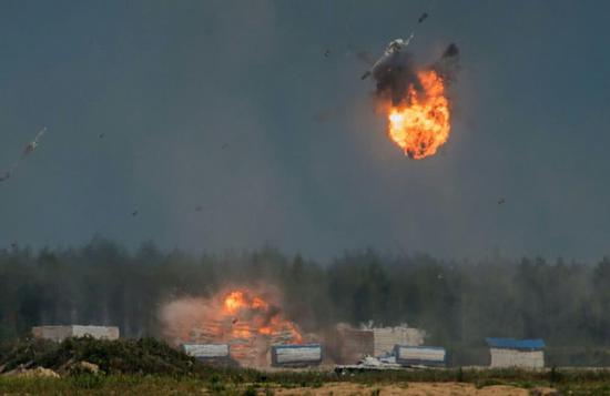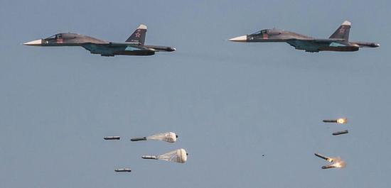 [环球网军事报道]据国外社交媒体的照片显示,两架俄罗斯苏-34战斗轰炸机投弹时两枚炸弹在空中相撞。
