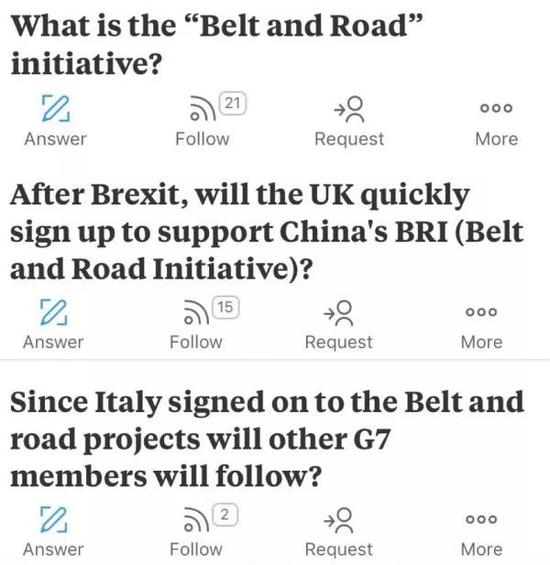 “‘一带一路’是什么?”“脱欧后,英国会不会很快就签署协议支持中国的‘一带一路’?”“意大利加入‘一带一路’倡议,G7其他成员会跟进吗?”