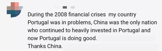 “当2008年发生全球性金融危机时,我的国家——葡萄牙遇到了问题,中国是唯一一个继续深入投资葡萄牙的国家,现在葡萄牙很好。谢谢中国。”一位葡萄牙网友动情写道。