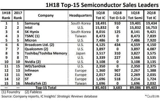2017年三星凭借53.6%的年增长率,终结了英特尔霸榜25年的地位,成为2017年全球营收第一的半导体企业。