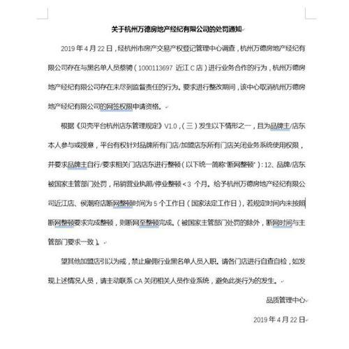 早在4月22日,杭州地产中介圈就悄悄传送着一份来自贝壳找房内部的处罚单,该处罚单显示,万德房地产聘用了黑名单人员蔡骋,因此被杭州市房产交易产权登记管理中心取消网签资格。蔡骋早在2018年4月就被房管局拉入了黑名单,原因是“存在炒卖房号的违法违规行为”,并在房管局官网公示。由于品牌被主管部门处罚,贝壳找房要求其停业整顿。
