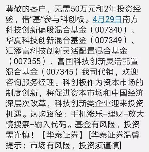 华泰证券将代销南方科技创新混合、华夏科技创新混合、汇添富科技创新灵活配置混合、富国科技创新灵活配置混合。推介短信称,科创板作为资本市场的制度创新,将促进资本市场和中国经济深层次改革,科技创新类企业迎来投资机遇。