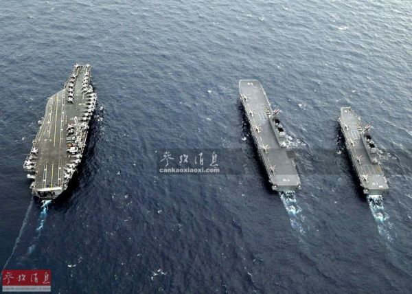 资料图:日本海自“出云”号(中)、“日向”号直升机航母与美军尼米兹级核航母编队航行。