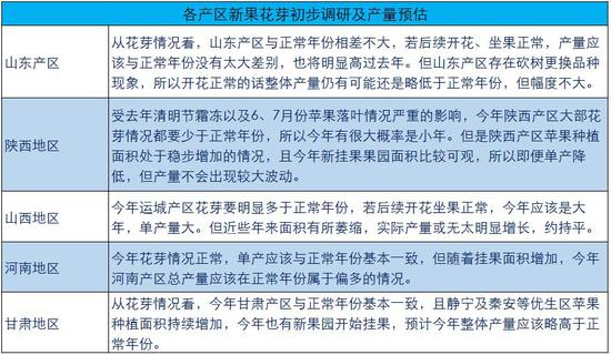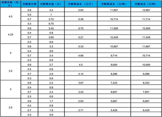 进入二季度,市场对于新季合约的关注点主要是生长期的异常天气,前期主要为花期的冻害天气,后期为果实成长期产区发生冰雹等异常天气。关于冻害天气的预测目前尚无好的指标跟踪,但是从跟果农和资深专家了解到,今年发生极端冻害天气概率很小,而且即使发生冻害天气对苹果的影响或不大,主要是今年清明节前期气温同比去年偏低,果树花期推迟(2018年则由于清明节前气温较高,果树花期提前)。关于新年度苹果产量预估方面,结合中国苹果网3月初做的初步调研结果看,见表5),新季苹果产量或较正常年份相差不大,属丰产年。再者2018年郑商所对远月合约的交割规则做了修正,以使苹果期货更好的服务苹果产业,从新旧标准对比看,新合约放宽了交割果范围,(具体修订见图8),降低了交割难度,仓单成本下降。结合上述两个方面,即在丰产预期及交割标准放宽的背景下,我们预计新季苹果仓单成本或在6500到8000之间。