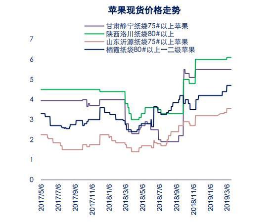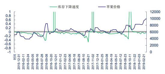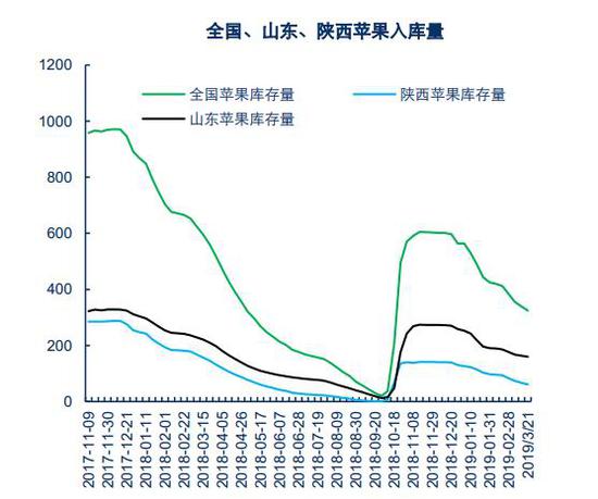供应端,二季度市场苹果仅由库存果供给,因此库存的变化对苹果价格至关重要。从库存绝对量上看,2018年受春季冻害影响,苹果产量大幅下滑,截至2018年11月中下旬,苹果入库结束,根据卓创资讯统计,截至2018年11月8日全国苹果入库量591万吨,同比2017年入库量958万吨下降38.3%,其中陕西入库量137万吨,同比下降51.7%,山东入库量约268万吨,同比下降16.5%。随着库存的消化,截至3月21日,全国苹果库存量323.9万吨,其中陕西库存60.9万吨,山东库存159.6万吨。