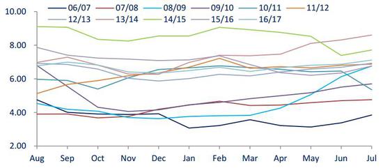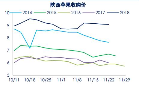 图7:历年陕西产区苹果收购价 单位:元/公斤
