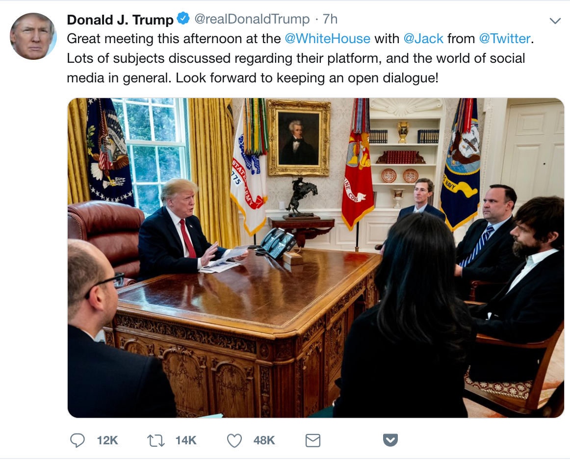 不过,就在与推特CEO Jack Dorsey的会谈结束后,特朗普一改之前的观点,并发布推文称:“今天下午与推特的Jack会谈非常开心。讨论了许多有关平台、社交媒体的话题,期待保持开放的对话!”