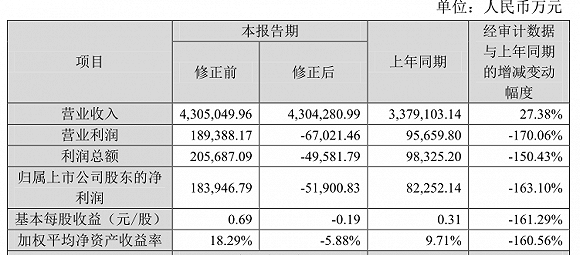 4月26日,欧菲科技发布业绩快报修正,年报业绩大“变脸”,营业利润由此前的盈利18.93亿元,修正至亏损6.7亿元,变动幅度-170.1%,净利润总额由盈利18.39亿,转为亏损5.19亿。修正原因是计提资产减值准备等。26日开盘后,欧菲光开盘一字跌停,卖一封单超过两百万手。值得注意的是,自欧菲光1月31日公布大幅预增的业绩快报,截止今日发布业绩修正期间,欧菲光股价上涨一度超过50%。