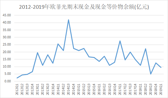 一方面大股东频繁质押,另一方面公司的偿债能力却不容乐观。根据公司2018年年报,2018年公司现金及现金等价物净增加额为-2.33亿,同比年初减少222.1%。实际上近年来,欧菲光的现金状况一直在恶化,公司期末现金及现金等价物余额自2014年四季度以来,呈现持续下跌趋势,2018年第三季度期末现金及现金等价物余额仅为5.04亿元,相较于二季度的22.25亿元大幅下降77%,这公司自2012年以后的历史最低值。