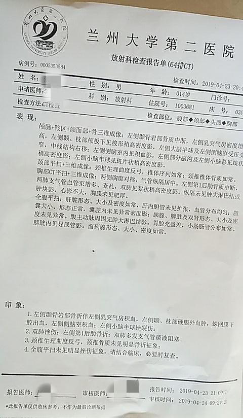 据张昇父亲张先生介绍,孩子母亲到校后,才将儿子送往陇西县第一人民医院救治时,当时已经接近下午四点。医生诊断张某的伤势严重,头部血管破裂。院方随后将张昇转至兰州大学第二医院接受治疗。张先生提供的检查报告显示,张昇双肺挫伤;肋骨骨折;左侧小脑半球挫裂伤;左侧侧脑室积血。最终,经过一个多小时的抢救,张昇不幸离世。