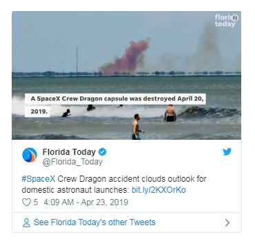 载人舱Crew Dragon的受损程度尚不清楚,但根据事故后出现的图像,特定的Crew Dragon似乎没有良好的状态。SpaceX和NASA都没有透露过未来的测试计划。