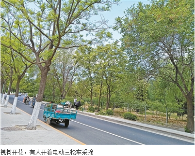 随后在双桥司辛庄南路,记者也发现有多位市民在采摘槐花。
