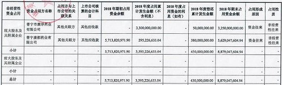 关联方资金占用专项报告显示,康美药业现大股东及其附属企业普宁市康淳药业有限公司(下称康淳药业)和普宁康都药业有限公司(下称康都药业)是占用上市公司资金的两大主要关联方,在2018年初这两家公司占用资金分别约为0元、57.14亿元,2018年累计占用金额(不含利息)分别达到33亿元、2.95亿元,期内分别累计偿还0.5亿元、3.8亿元,截至去年底占用资金余额分别为32.50亿元、56.29亿元,合计约为88.79亿元。