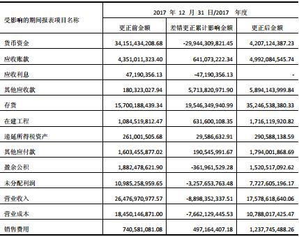 由于公司采购付款、工程款支付以及确认业务款项时的会计处理存在错误,造成公司应收账款少计6.41亿元,存货少计195.46亿元,在建工程少计6.32亿元;