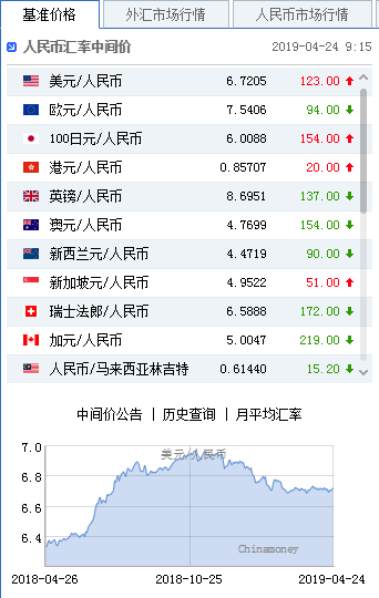 新浪财经讯 4月24日,美元指数强势拉升,人民币中间价报6.7205 ,下调123点,上一交易日中间价报6.7082,在岸人民币上一交易日收报6.7192。中国央行进行2674亿元TMLF操作,为创设该工具以来第二次实施操作;操作利率3.15%,与上次操作持平,仍较MLF利率优惠15个基点。