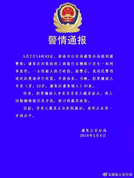 5月4日,安徽省淮南市潘集公安局微博通报,5月2日14时43分,淮南市公安局潘集分局接到报警称:潘集区田集街道工商银行东侧路口发生一起刑事案件,一女性被人持刀砍伤。接警后,民警迅速赶赴现场进行处置,开展侦查。