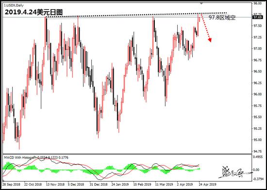 4月23日(周二)美元指数大幅的冲高,开盘于97.28,最高97.78,最低97.26,收盘97.55,上涨0.27%;美元指数守住近三周的高位,并创出去年以来的新高。美国公债收益率走高,以及美股走高;美国经济公布的经济数据好于市场预期,加之投资者对于第一季度GDP向好预期提振美元指数大幅的上扬;