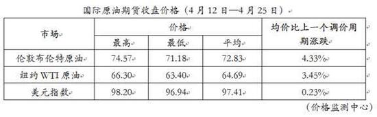 据国家发改委价格监测中心监测,本轮成品油调价周期内(4月12日—4月25日),国际油价继续震荡上行。平均来看,伦敦布伦特、纽约WTI油价比上轮调价周期上涨3.89%。受此影响,国内汽油、柴油零售价格随之上调。