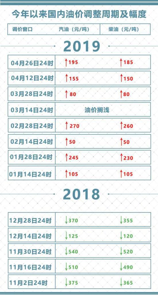 央视财经记者从国家发改委获悉,本次油价调整具体情况如下:汽油每吨上调195元、柴油每吨上调185元。届时,2019年国内成品油价格将呈现“第七涨”。