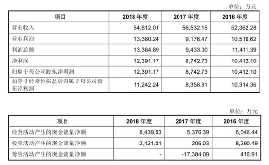 2018年,博通集成营业收入下滑,经营性现金流连续三年低于净利润。2016年至2018年,博通集成实现营业收入分别为5.24亿元、5.65亿元、5.46亿元,实现归属于母公司股东净利润分别为1.04亿元、8742.73 万元、1.24亿元,经营活动产生的现金流量净额分别为6046.44万元、5376.39万元、8439.53万元。