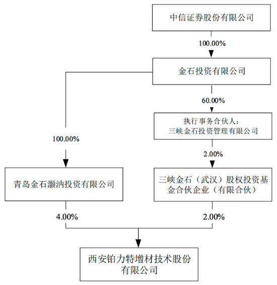 中信证券全资控股的子公司金石投资有限公司,一方面通过旗下全资子公司青岛金石灏汭投资有限公司持有铂力特4%的股权,另一方面通过旗下控股子公司三峡金石投资管理有限公司持有三峡金石(武汉)股权投资基金合伙企业(有限合伙)的股份,后者则持有铂力特2%的股权。