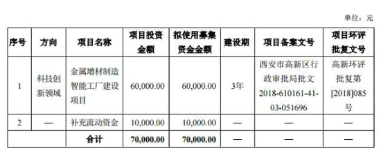 其中,金属增材制造智能工厂建设项目的投资额为60000元,另外10000元为补充流动资金,总计70000元。