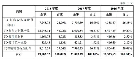 在上述不同产品种类中,3D打印定制化产品所贡献的业务收入占比最多,在2016年到2018年期间一直稳定在40%左右。代理销售设备及配件的收入占比约为三成,仅次于3D打印定制化产品。此外,3D打印设备及配件的收入占比约在20%左右,而3D打印原材料、3D打印技术服务的收入占比较低。