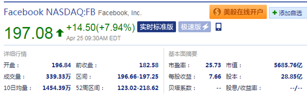 新浪科技讯 4月25日晚间消息,Facebook开盘涨7.81%,报196.84美元。