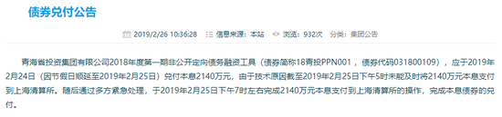此外,2019年2月,因两笔债券未及时兑付引发市场对青投集团热切关注。其中,一款到期兑付日为2月24日的债券产品,到2月25日尚未将本息划转至上海清算所,还有一笔债券是美元债券,也未能按时偿付利息。尽管2月26日、27日发声称投资者已经完成相关的支付。不过,仅一日之差,也难逃违约的标签。