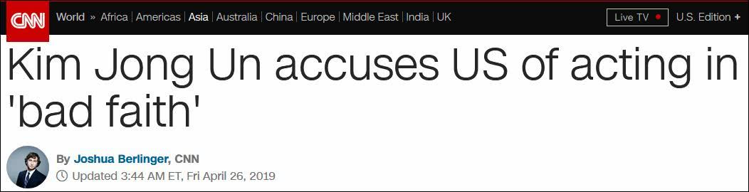 美国有线电视新闻网(CNN)认为,金正恩的这番话表示,美国“信用很差”(bad faith)。
