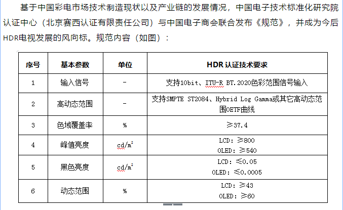 所以说,大家不要被商家的宣传所迷惑, 6000 元内宣传有HDR功能的电视几乎只是芯片支持,屏幕不支持。但又拿商家没撤,毕竟人家都标注是芯片支持HDR了。所以国内相关行业协会在 2016 年制定了一个统一标准,大家可以参考这些参数选择电视。