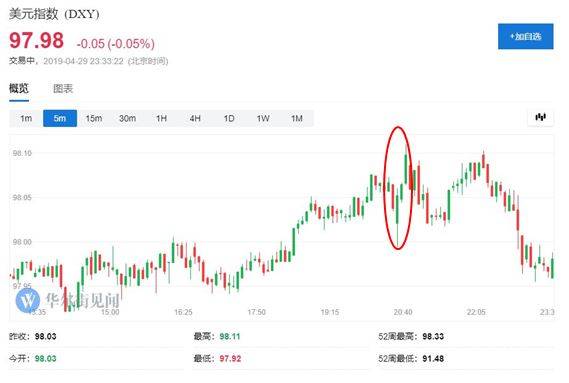 数据公布时,美元指数短线下探98整数关口,之后迅速回弹,并一度刷新日高至98.11。美股开盘后,美元指数逐渐回落至98关口下方。