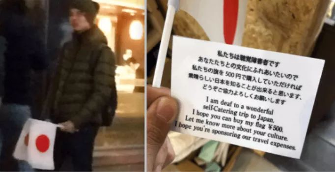 在大多数情况下,这些人试图用国旗来换钱,同时他们还会出示带有信息的卡片,说他们是来“了解日本文化”的。例如,其中一人说:“如果你给我500日元买国旗,我就能了解日本的富裕程度。”