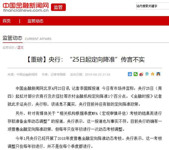 而就在刚刚过去的4月23日,针对市场惦记的降准,央行再次出面否认。4月23日,针对有市场传言称:央行25日(周四)起拟对部分农商行及农信社等农村金融机构定向降准1个百分点。据央行旗下媒体《金融时报》报道,央行方面称该消息不属实,央行目前并没有新的定向降准政策。