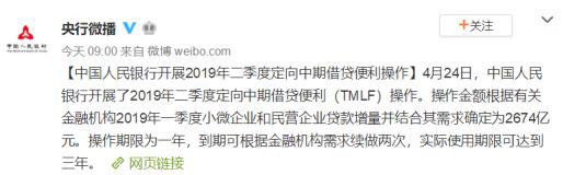 2019年4月24日,中国人民银行开展了2019年二季度定向中期借贷便利(TMLF)操作。