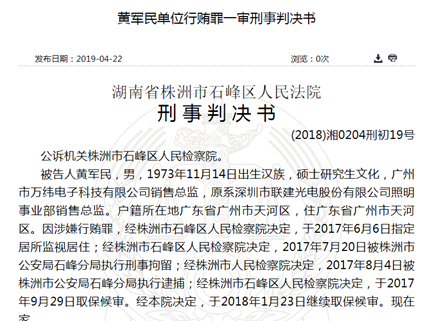 新浪财经讯 近日裁判文书网显示,联建光电原照明事业部总监黄军民为了帮助单位在神农城LED显示屏项目竞标中胜出,向神农城规划设计组副组长彭某2及其弟彭某1行贿160多万元,黄军民及照明事业部因此项目获利130万元。