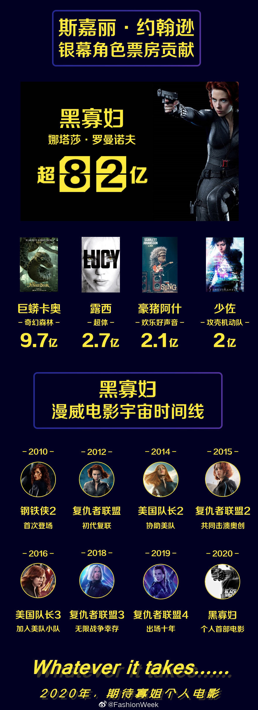 斯嘉丽·约翰逊扮演的超级战士“黑寡妇”自从在《钢铁侠2》中首次亮相,此后人气一路高涨,稳坐漫威电影宇宙的“一姐”位置。其主演的《黑寡妇》也将于2020年上映。