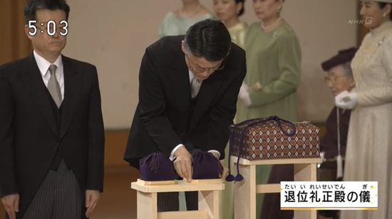 据报道,在退位仪式中,天皇和皇后在进入“松之间”后,侍从将象征皇位的剑玺、天皇的玉玺、国印的国玺,一同放置在殿中被称为“案”的台上。