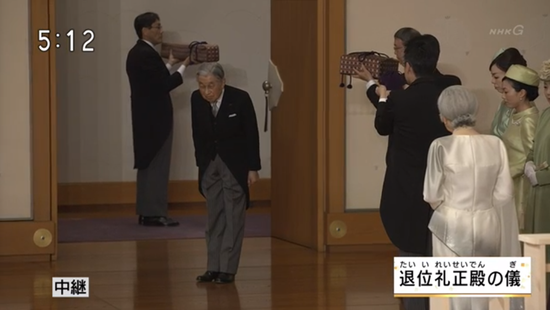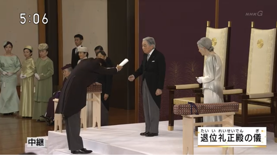 [环球网报道 记者 崔天也 崔舒飞]日本广播公司(NHK)刚刚消息,当地时间下午5时许日本明仁天皇在“松之间”宫殿进行天皇退位的重要仪式“退位礼正殿之仪”。