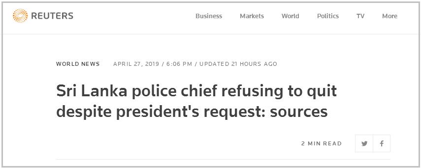 据路透社4月28日报道称,西里塞纳因未能阻止袭击而面临批评,他指责警察总长和国防部长没有事先向他通报袭击警告,因此要求两人辞职。但根据斯里兰卡首都广播公司的两名消息人士表示,贾亚桑达拉拒绝递交辞呈,但这两位消息人士拒绝透露姓名,因为他们没有获得与媒体对话的授权。