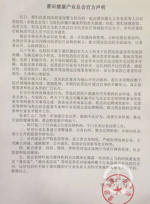 莆田健康产业总会发布的官方声明 本文图均为 上游新闻 图