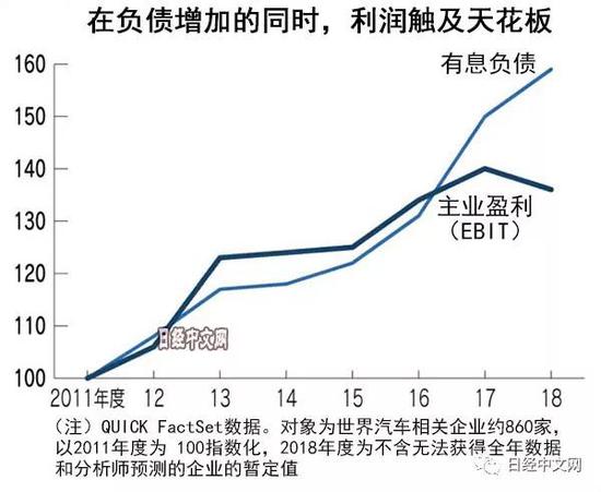 全球汽车产业的财务和业绩都受到压迫。与CASE相关的投资和研发的负担沉重,全球汽车相关企业的有息负债2018年度达到1.7万亿美元左右,似乎创出历史新高。同时全球经济减速也构成逆风,企业的业绩也呈现增长乏力态势。