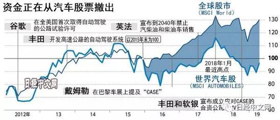 在同一期间,美国福特汽车、德国戴姆勒和日产汽车的股价下降2~3成。丰田和本田也下降1~2成。另一方面,美国通用汽车和德国大众上涨近2成。通用和大众均敲定了包括裁员在内的重组举措,在市场上被认为将容易筹集应对CASE的资金。