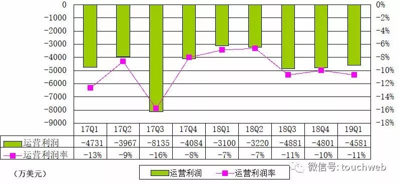 搜狐第一季度美国通用会计准则营业亏损为4600万美元,2018年同期营业亏损为3100万美元,上一季度营业亏损为4800万美元。搜狐第一季度运营利润率为-11%。