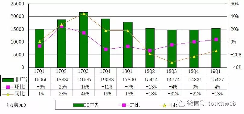 搜狐第一季度非广告收入为1.54亿美元,较上一季度的1.48亿美元增长4%,较上年同期的1.78亿美元下降13%。