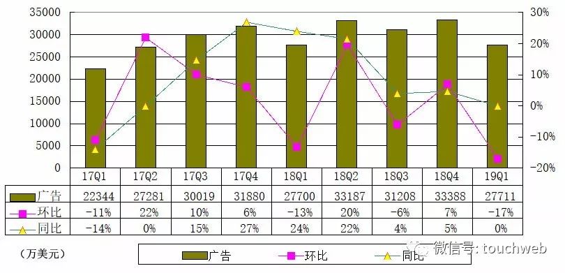 搜狐第一季度在线广告总收入为2.77亿美元,较2018年同期增长持平,较上一季度下降17%。在线广告总收入包括品牌广告和搜索及搜索相关业务广告收入。