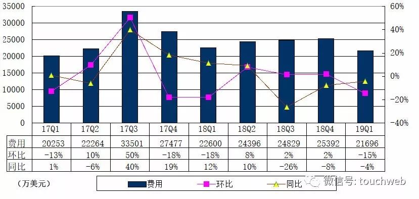搜狐第一季度美国通用会计准则营业费用为2.17亿美元,较2018年同期下降4%,较上一季度下降15%。