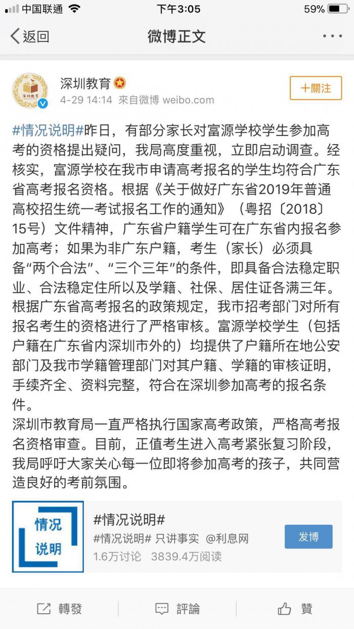 对此,4月29日,深圳市教育局通过官方微博作出回应:经核实,富源学校在我市申请高考报名的学生均符合广东省高考报名资格。